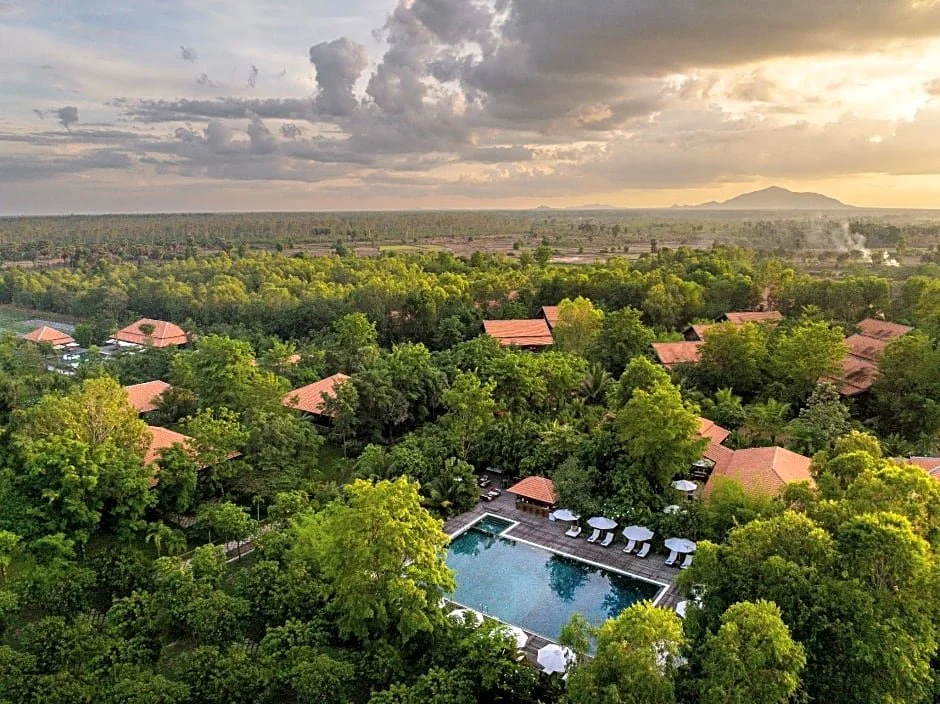 Experience luxury at Farmhouse Resort & Spa, with 24 traditional wooden houses nestled on the 150-hectare Smiling Gecko campus. Enjoy Khmer-style bungalows, farm-to-table dining, and an award-winning spa while supporting rural Cambodian development.